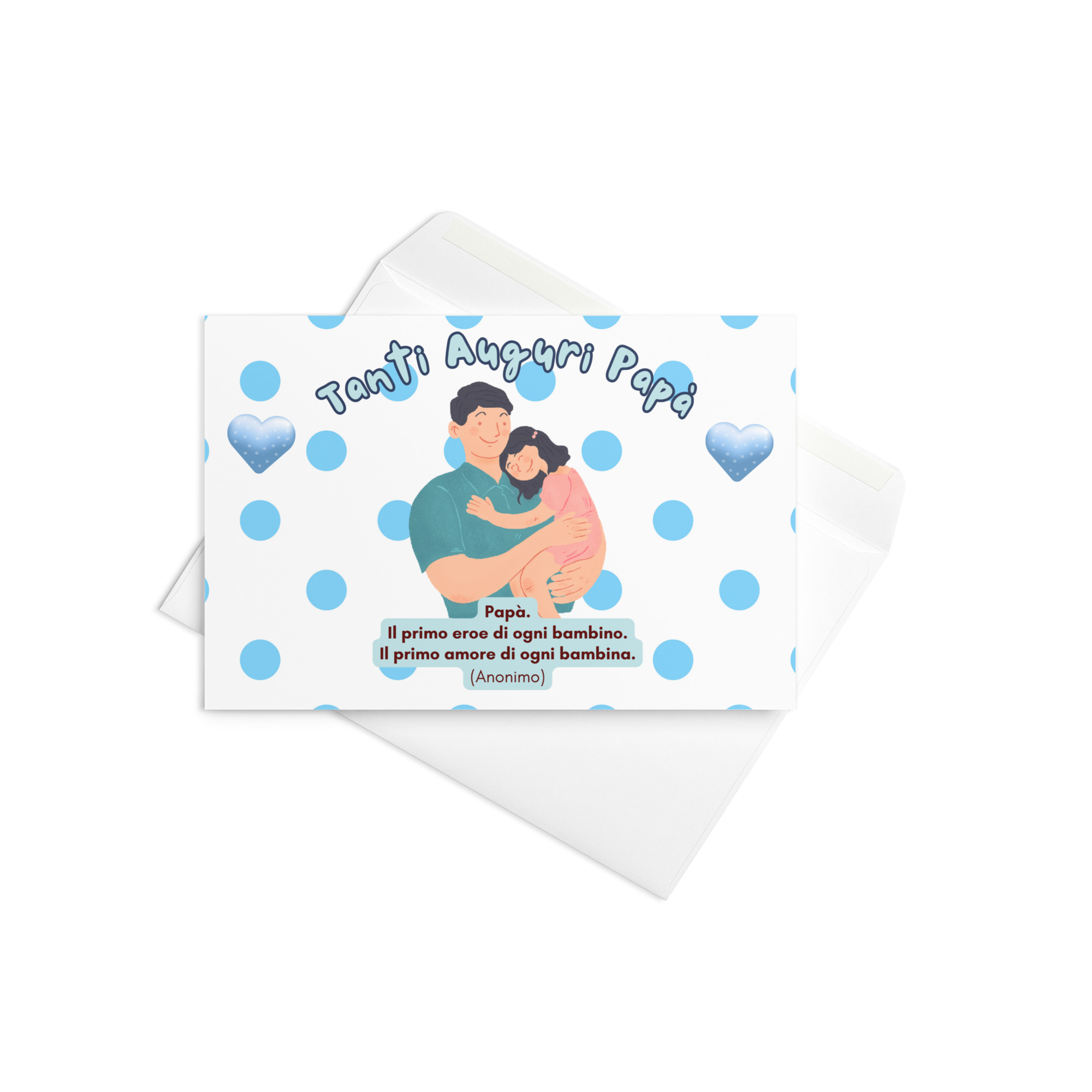 Caratterizzato da un design giocoso con cuori e pois azzurri che fluttuano come palloncini, questo biglietto presenta al centro un tenero abbraccio tra un padre e sua figlia, un’immagine che cattura il calore e la sicurezza che solo un padre può trasmettere.